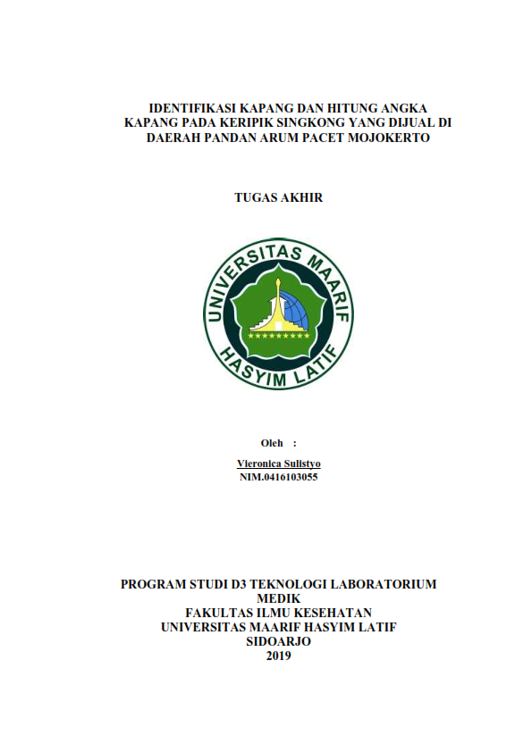 Keripik singkong adalah makanan yang terbuat dari singkong yang diiris tipis kemudian digoreng dengan menggunakan minyak goreng. Dan biasanya ditambahkan bumbu-bumbu penyedap lainnya.Tujuan penelitan ini untuk mengetahui ada atau tidaknya pertumbuhan kapang dan untuk mengetahui jumlah angka kapang yang tumbuh pada sampel keripik singkong yang dijual di daerah Pacet Mojokerto. Jenis penelitian ini adalah deskriptif kualitatif. Metode uji yang digunakan adalah angka kapang. Dari 20 sampel, menunjukkan bahwa 19 sampel teridentifikasi adanya Aspergillus niger dan 1 sampel negatif kapang. Angka kapang yang diperoleh dari sampel keripik singkong adalah <15 Cfu/g. Menurut SNI 2009 dengan jumlah koloni 1X10ยน koloni/g.