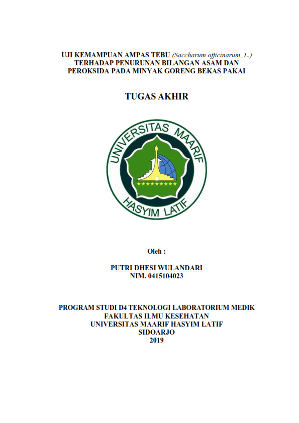 Cooking oil is a liquid oil from plants such as plam oil, soybeans, corn, olives. The us of cooking oil repeatedly can cause damage to the oil, because during the process of frying with cooking oil, there is hidrolysis and oxidation reaction which forming free fatty acids and peroxide. Baggase contains cellulose fiber, which causes the structure to be permeable so that the bagasse can be used as an adsorbent. Therefore this study was to determine the decrease in acid number and peroxide after 24 hours immersion. Testing was carried out by adding 5cm of bagasse to used cooking oil. Then the determination of the peroxide and acid number using the titrimetric methode. Peroxide was determined by iodometric methods, free fatty acid value by alkali titration. The the result showed a decrease in acid number after a 24 hours adsorotion precess of 46,4% and peroxide number to 50%. Based on this research it can be concluded that bagasse has adsorption on free fatty acids and peroxide.