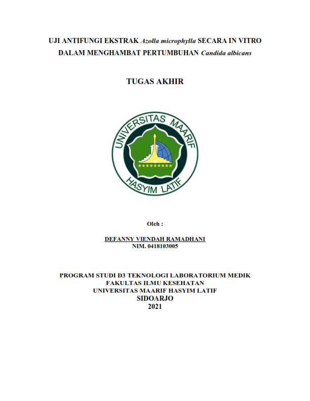Candida albicans adalah jamur bersel satu dan juga jenis jamur yang menyebabkan infeksi candida atau kandidias yang merupakan flora normal rongga mulut, vagina dan usus besar. Salah satu tumbuhan yang berpotensi sebagai zat antijamur adalah Azolla microphylla. Penelitian ini bertujuan untuk mengetahui kemampuan dari ekstrak azolla microphylla dalam menghambat pertumbuhan Candida albicans. Metode yang digunakan adalah disk difusi dengan bahan penelitian yaitu ekstrak azolla microphylla dengan berbagai variasi konsentrasi antara lain 1600, 800, 400, 200 , dan 100 ppm. Hasil penelitian menunjukan dari kelima variasi konsentrasi tidak adanya efektivitas dari ekstrak azolla microphylla sebagai antijamur Candida albicans. Berdasarkan penelitian tersebut diperoleh kesimpulan bahwa ekstrak azolla microphylla tidak mempunyai kemampuan dalam menghambat pertumbuhan Candida albicans dengan konsentrasi yang rendah.
