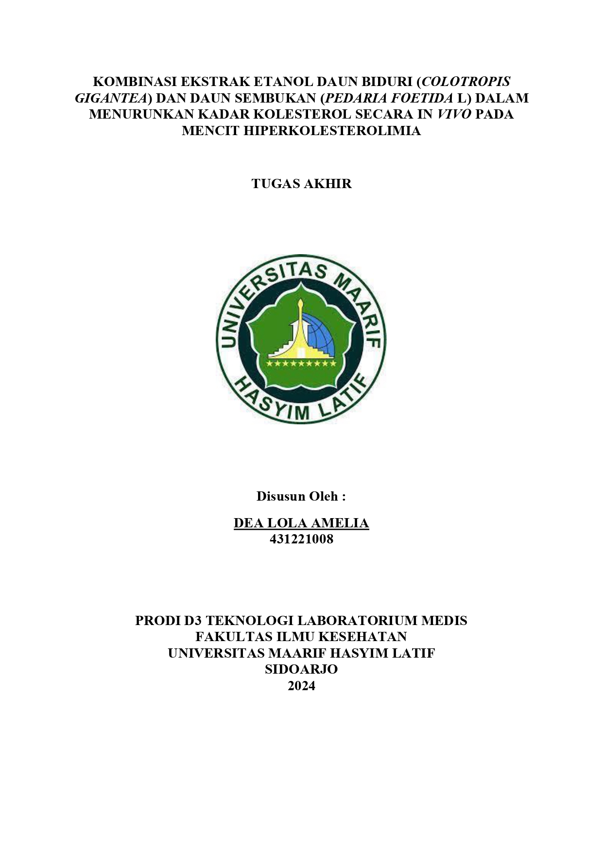Lemak adalah elemen gizi serbaguna yang mendukung berbagai fungsi penting dalam kehidupan. Lemak juga memiliki dampak negatif pada tubuh kita sehingga peneliti mengambil judul Kombinasi Ekstrak Etanol Daun Biduri (Colotropis gigantea) Dan Daun Sembukan (Pedaria foetida L) Dalam menurunkan Kadar Kolesterol Secara In Vivi Pada Mencit Hiperkolesterolimia untuk mengtahui penurunan kadar kolesterol setelah pemberian ekstrak, selain itu peneliti juga ingin membandingkan hasil penelitian ini dengan penelitian sebelumnya yaitu Uji Aktivitas Anti-Hiperlipidemia Ekstrak Daun Sembukan (Pedaria foetida L) Pada Mencit (Mus Musculus) dan Aktivitas Ekstrak Etanol Daun Biduri (Colotropis gigantea) Sebagai Anti-Hiperlipidemia Secara In vivo. Jenis penelitian yang digunakan adalah eksperimental dan menggunakan metode pemeriksaan kadar kolesterol yaitu CHOD-PAP. Penelitian ini menggunakan variasi dosis yaitu Dosis I 14mg/20g BB, Dosis II 28mg/20g BB, Dosis III 56mg/20g BB. Setelah dilakukan perlakuan dosis Ekstrak Etanol Daun Biduri (Colotropis gigantea) Dan Daun embukan (Pedaria foetida L) menunjukan bahwa terdapat penurunan kadar kolesterol pada mencit hiperkolesterolimia, didaatkan selisih penurunan pada Dosis I yaitu sebesar (31%), Dosis II sebesar (28,7%), Dosis III sebesar (35,7%), dari hasil tersebut dapat disimpulkan dosis yang paling efektif dalam menurunkan kadar kolesterol pada mencit hiperkolesterolimia adalah dosis ke-3 yaitu 56mg/20g BB karena memiliki selisih penurunan paling besar.