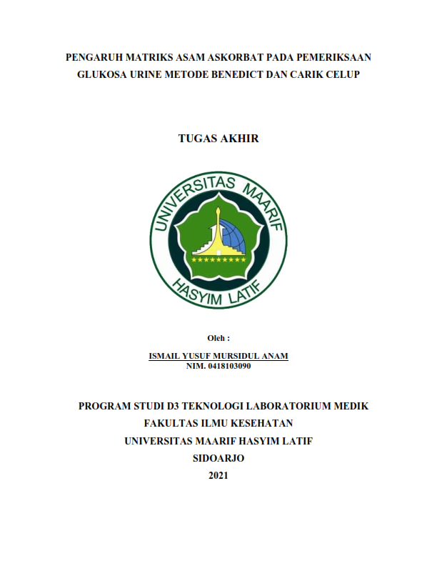Urinalisa digunakan sebagai pemeriksaan penyaring yang berfungsi untuk mengetahui potensi gangguan penyakit hati, penyakit diabetes mellitus, gangguan penyakit ginjal dan infeksi saluran kemih. Pemeriksaan urine banyak sekali parameternya, tetapi pada penelitian ini lebih difokuskan pada pemeriksaan Glukosa Urine. Jenis penelitian yang digunakan pada penelitian ini adalah metode eksperimen. Tujuan penelitian ini adalah untuk mengetahui seberapa besar pengaruh matriks asam askorbat pada hasil pemeriksaan glukosa urine metode benedict dan carik celup. Urine yang mengandung Asam askorbat kemungkinan besar dapat menimbulkan hasil positif palsu pada pemeriksaan glukosa urine, karena Asam askorbat adalah lakton enam karbon yang secara struktural mirip dengan glukosa. Glukosa dapat direduksi menggunakan larutan cupri sulfat yang menghasilkan endapan berwarna merah bata. Adanya asam askorbat dalam urine bisa menjadi oksidator yang bisa mengganggu reaksi glukosa dan benedict. Karena walaupun tidak ada kehadiran glukosa, asam askorbat bisa direduksi oleh benedict. Asam askorbat bisa mempengaruhi hasil pemeriksaan glukosa urine baik metode benedict ataupun carik celup.
