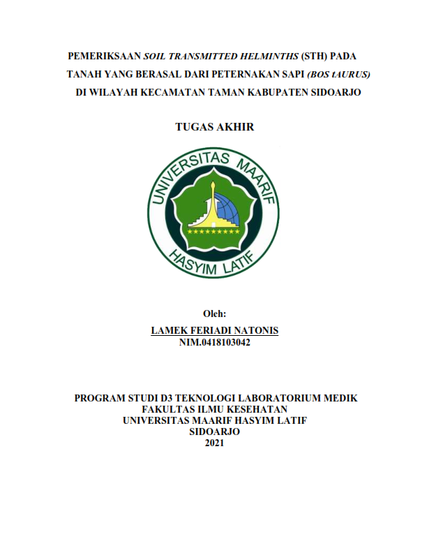 Infeksi Soil Transmitted Helminths merupakan masalah di bidang kesehatan masyarakat terutama didaerah pedesaan.Tiga jenis infeksi Soil Transmitted Helminths Ascaris lumbricoides,Trichuris trichiura dan cacing tambang (Hookworm) sering menunjukan kelainan klinik pada manusia.Penyebaran penyakit kecacingan didukung oleh keadaan alam yang cocok,hygiene perorangan dan sanitasi lingkungan rendah,khususnya di lingkungan Peternakan Sapi.Salah satu penularanya adalah Tanah yang sudah tercemar.Penelitian ini bertujuan untuk mengetahui adanya jenis telur yang terdapat pada tanah yang berasal dari Peternakan Sapi diwilayah Kecamatan Taman Kabupaten Sidoarjo.Penelitian ini dilakukan di Laboratorium Parasitologi Universitas Maarif Hasyim Latif Sidoarjo.Pada bulan April 2021.Pemeriksaan tanah tersebut dilakukan dengan metode pengapungan yakni Nacl jenuh.Berdasarkan penelitian yang telah dilakukan terhadap 20 sampel tanah,didapatkan 1 sampel positif telur Soil Transmitted Helminths,sedangkan 19 sampel lainya dinyatakan negatif,tidak terdapat telur Soil Transmitted Helminth.