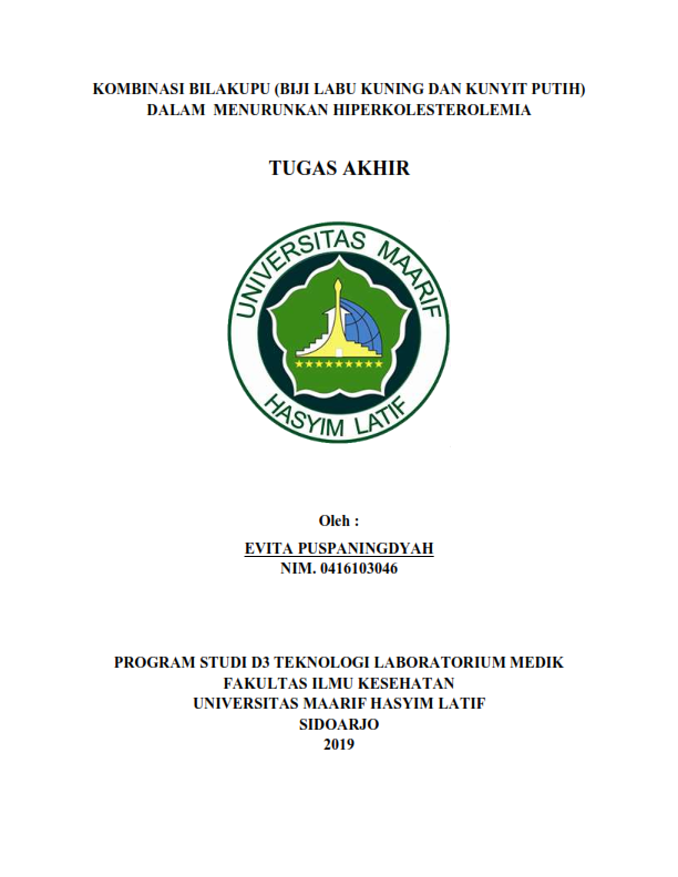 Kolesterol merupakan senyawa lemak yang lunak, seperti lilin yang diproduksi oleh hati dan sisanya diperoleh dari makanan. Hiperkolesterolemia adalah kadar kolesterol yang melebihi batas normal dalam. Pemeriksaan yang digunakan adalah kadar kolesterol. Biji labu kuning (Cucurbita moschata) dan kunyit putih (Curcuma mangga Val.) merupakan tanaman yang mudah didapatkan oleh masyarakat. Tujuan penelitian ini ialah untuk mengetahui adanya pengaruh kombinasi BILAKUPU (biji labu kuning (Cucurbita moschata) dan kunyit putih (Curcuma mangga Val.)) dalam menurunkan hiperkolesterolemia yang telah diberi jeroan ayam. Penelitian ini dilakukan di IKHP (Instalasi Kandang Hewan Percobaan) PUSVETMA (Pusat Veteriner Farma), dilakukan pada bulan November 2018 – Maret 2019. Pengumpulan data pada penelitian ini menggunakan studi eksperimental yaitu dengan 30 ekor mencit yang dibagi menjadi 3 kelompok. Hasil penelitian menunjukkan bahwa adanya perbedaan antara kelompok kontrol positif dengan kelompok terapi yang ditunjukkan dengan uji statistik yaitu uji Paired T-Test.