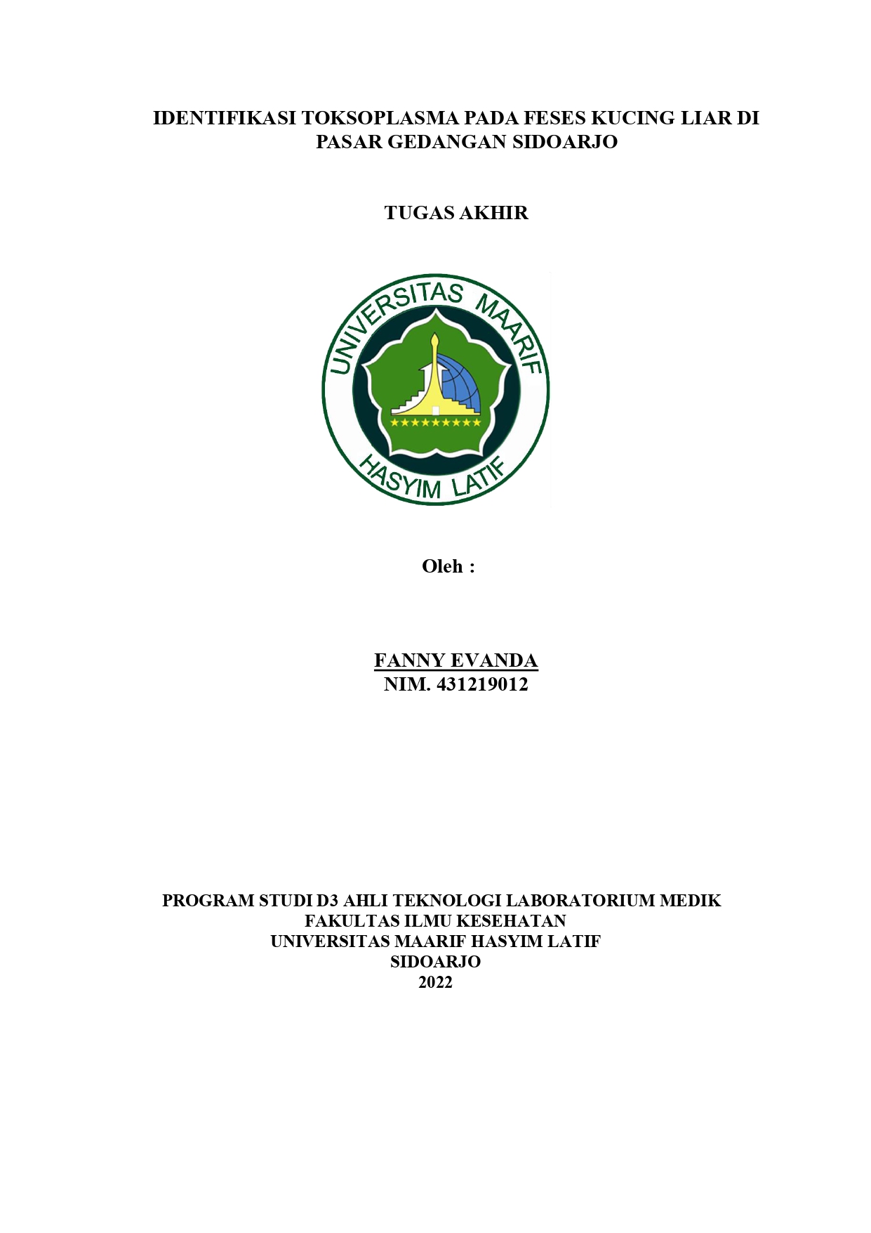 Toxoplasma gondii merupakan parasit golongan protozoa yang dapat menginfeksi semua jenis hewan berdarah panas, termasuk manusia yang dapat menyebabkan penyakit toxoplasmosis. Sumber utama infeksi toxoplasmosis ialah oosista yang hanya dikeluarkan oleh kucing melalui tinjanya karena kucing Satu – satunya hospes defenitif dari parasit ini .Penelitian ini bertujuan untuk identifikasi adanya parasit toxoplasma gondii pada kucing liar yang ada di wilayah pasar gedangan sidoarjo, jenis penelitian yang dilakukam yaitu dengan eksperimen yang hasilnya ditampilkan secara deskriptif, dimana penelitian ini akan menggambarkan keberadaan toxoplasma gondii pada tinja kucing berupa narasi, penelitian ini menggunakan metode pengapungan (fluotation) dengan menggunakan larutan Nacl jenuh sebagai larutannya. Metode ini didasarkan pada perbedaan berat jenis antara larutan pengencer dan sampel. Larutan pengencer memiliki berat jenis yang lebih besar sehingga sampel akan terapung. hasil pemeriksaan mikroskopis jumlah sampel feses kucing yang ditemukan adanya Ookista Toxoplasma gondii sebanyak 4 sampel feses dari 20 sampel, persentase hasil positif pada sampel tinja kucing yang berada di pasar gedangan adalah 20% sedangkan persentase negatif berjumlah 80%. Berdasarkan hasil penelitian, dapat diambil kesimpulan bahwa di Pasar Gedangan Sidoarjo terdapat Toxoplasma gondii pada feses kucing.