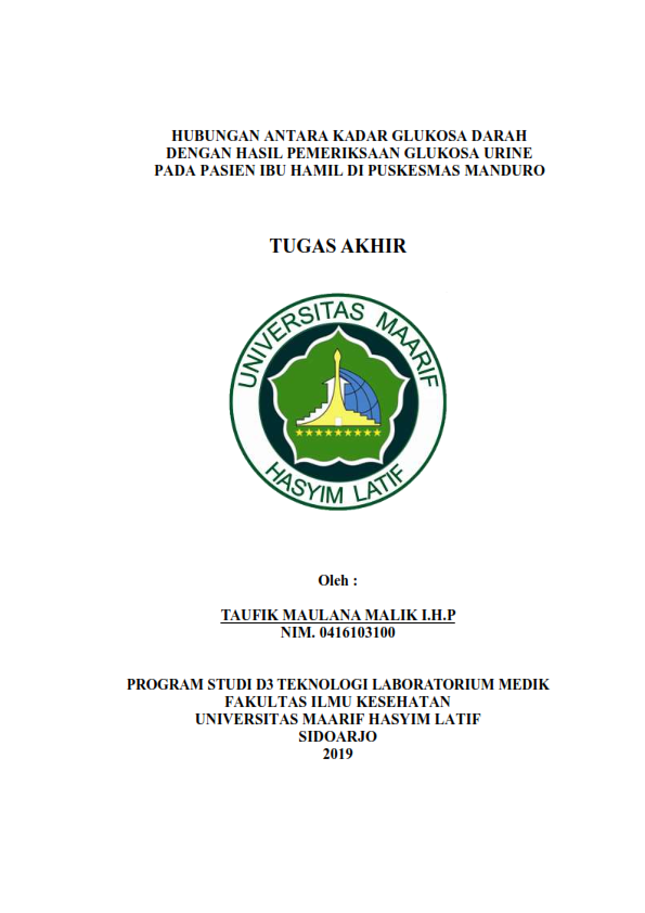 Diabetes Melitus Gestasional (DMG) adalah suatu gangguan toleransi glukosa yang terjadi atau diketahui pertama kali pada saat kehamilan sedang berlangsung. Keadaan ini biasa terjadi pada saat 24 minggu usia kehamilan dan sebagian kadar glukosa darah penderita akan kembali normal setelah melahirkan, pada saat seorang ibu hamil mengalami Diabetes Melitus Gestasional (DMG) hal ini disebabkan karena tingginya kadar glukosa dalam tubuh yang melebihi ambang batas. Pemeriksaan skrening yang dilakukan untuk mengetahui nilai dari kadar glukosa dalam tubuh adalah pemeriksaan glukosa darah metode POCT dan pemeriksaan glukosa urine metode carik celup. Penelitian yang telah dilakukan di puskesmas Manduro menunjukan dari 20 pasien ibu hamil dengan usia kehamilan trimester satu hingga trimester tiga menunjukkan 3 pasien menunjukkan kadar glukosa darah tinggi sedagkakan 17 pasien menunjukkan glukosa darah normal perbandingan dari data tersebut menunjukkan 15% ibu hamil dengan kadar glukosa darah tinggi dan 85% ibu hamil dengan glukosa darah normal, sedangkan untuk glukosa urin dari 20 pasien ibu hamil trimester satu hingga trimester tiga menunjukkan hasil 17 pasien glukosa urine negatif 3 pasien glukosa urine positif perbandingan dari data tersebut menunjukkan 15% ibu hamil dengan kadar glukosa urine positif dan 85% ibu hamil dengan glukosa urine negatif . Adanya hasil tersebut perlu dilakukan pemeriksaan urine dengan metode benedict atau fehling.